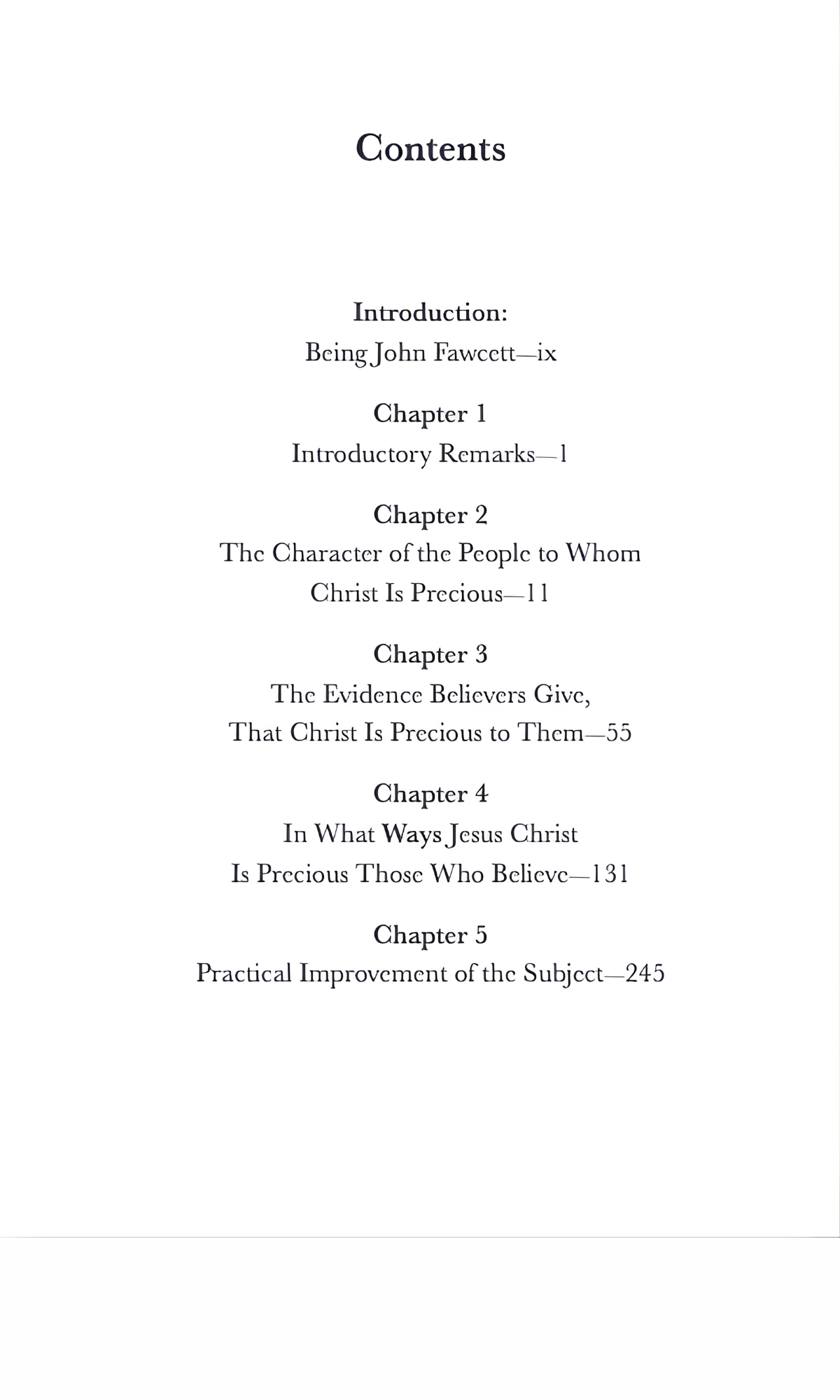 Written in 1799, Christ Precious to Those Who Believe: The preciousness of Jesus Christ, to those who believe—practically considered and improved by John Fawcett is a "minor spiritual classic of the eighteenth century that deserves to be better known. In it, Fawcett explores the way that 'love is the parent and promoter of every thing excellent and amiable in the Christian character,' a love that is, first and foremost, a love for the Lord Jesus Christ" (Michael Haykin, introduction).